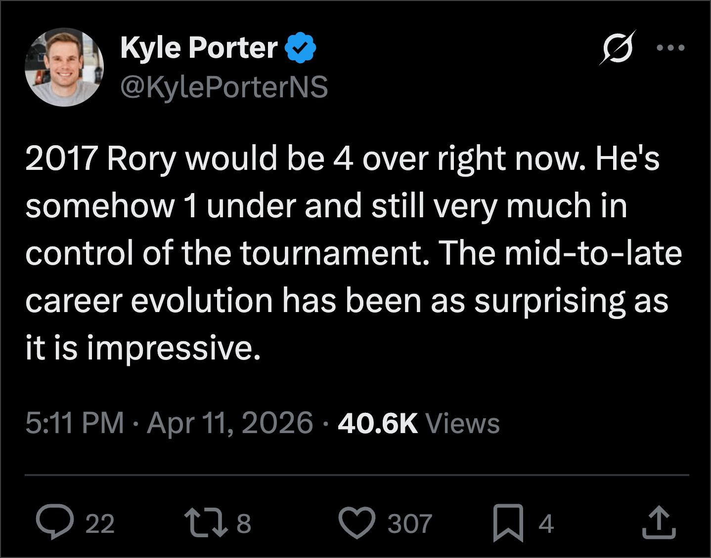 A lot of comps got made during the fallow period when Rory didn’t win any majors. Spieth, Day and even players like Rickie Fowler. Those seem almost comical now. The longer this goes on, the more obvious his place in history will become.