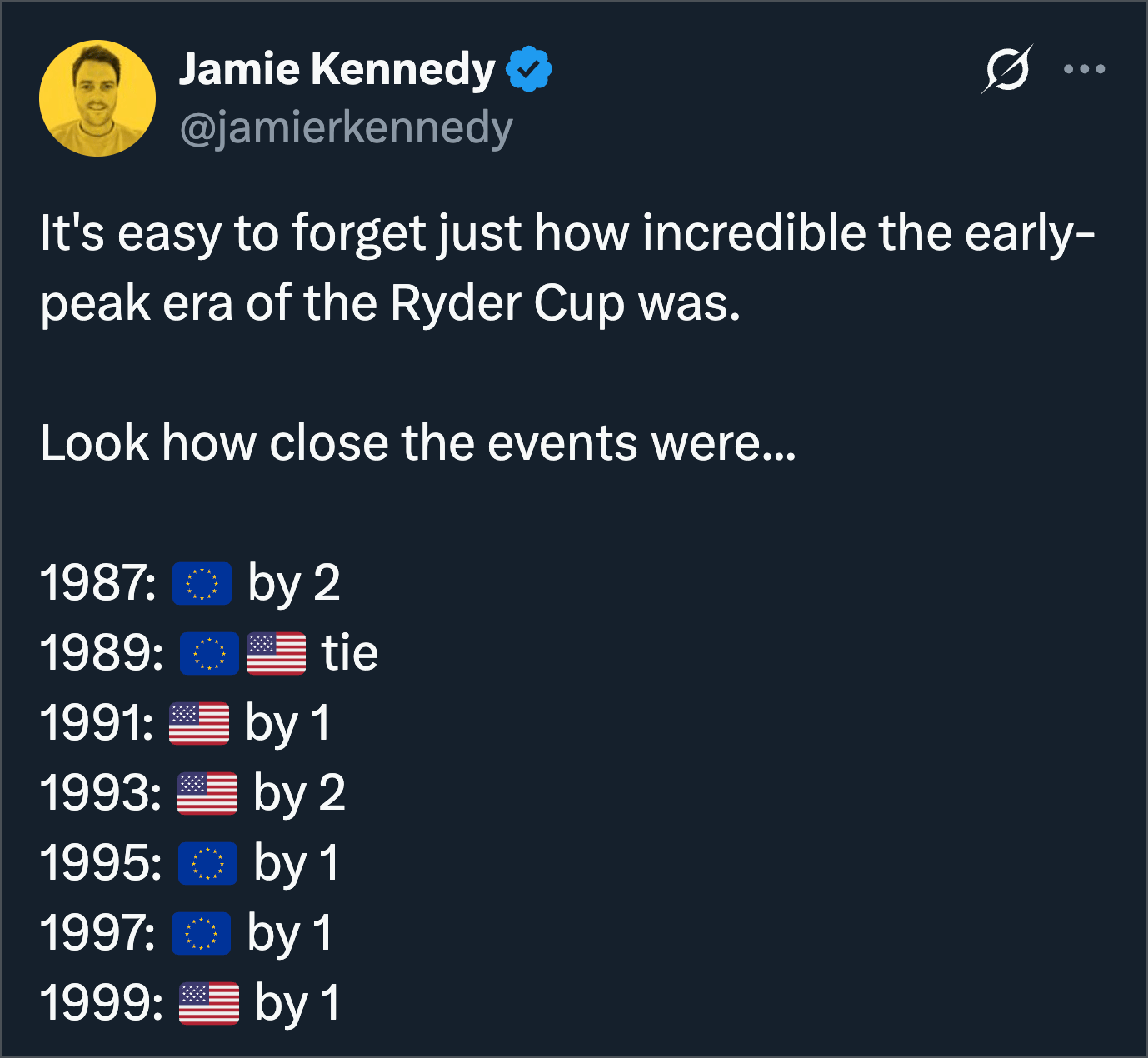 Especially compared to a couple of decades ago when every Ryder Cup came down to the last few matches.