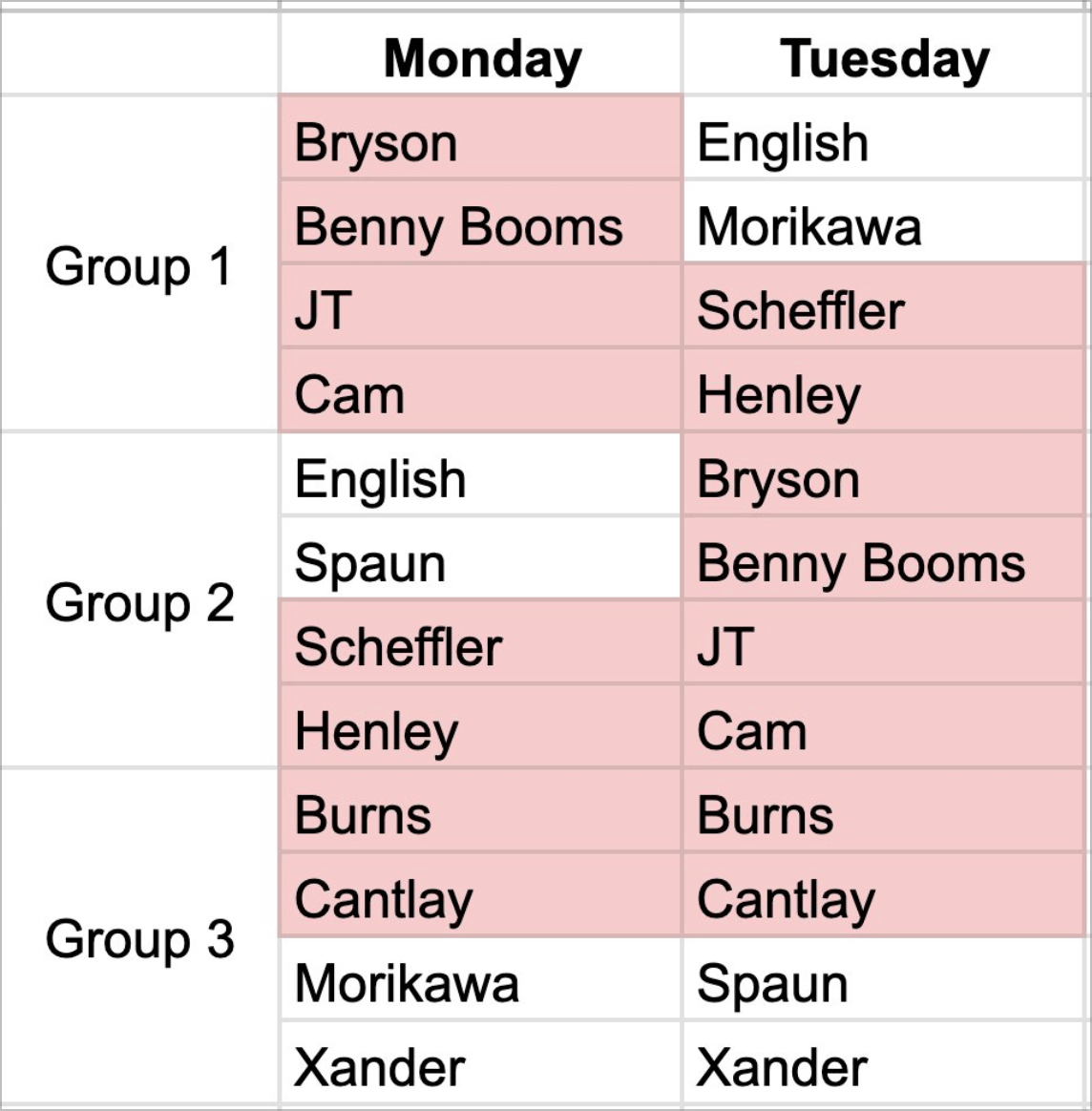 Here’s a look at who was together on Monday and Tuesday at Bethpage. Benny Booms, by the way, is apparently the U.S. social media team’s nickname for Ben Griffin (?). Surely that must be an inside joke that I don’t get. Surely. Regardless, I will not be taking questions at this time.