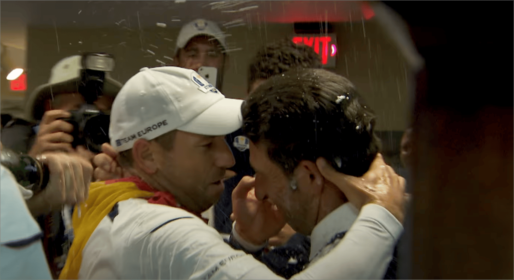 This part specifically, players chanting, “Seve! Seve! Seve!” in the locker room at Medinah as Sergio and Jose Maria embraced, just lit me up. Whew.