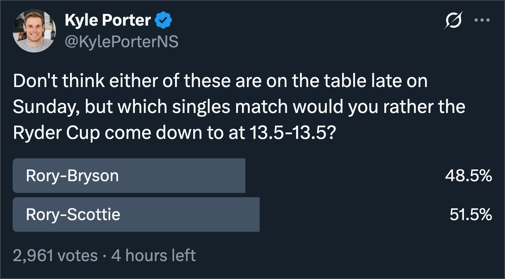 9. Like I said in the tweet below, I don’t think either Rory-Bryson or Rory-Scottie is on the table in terms of deciding the event late on Sunday … but could you imagine either of those?