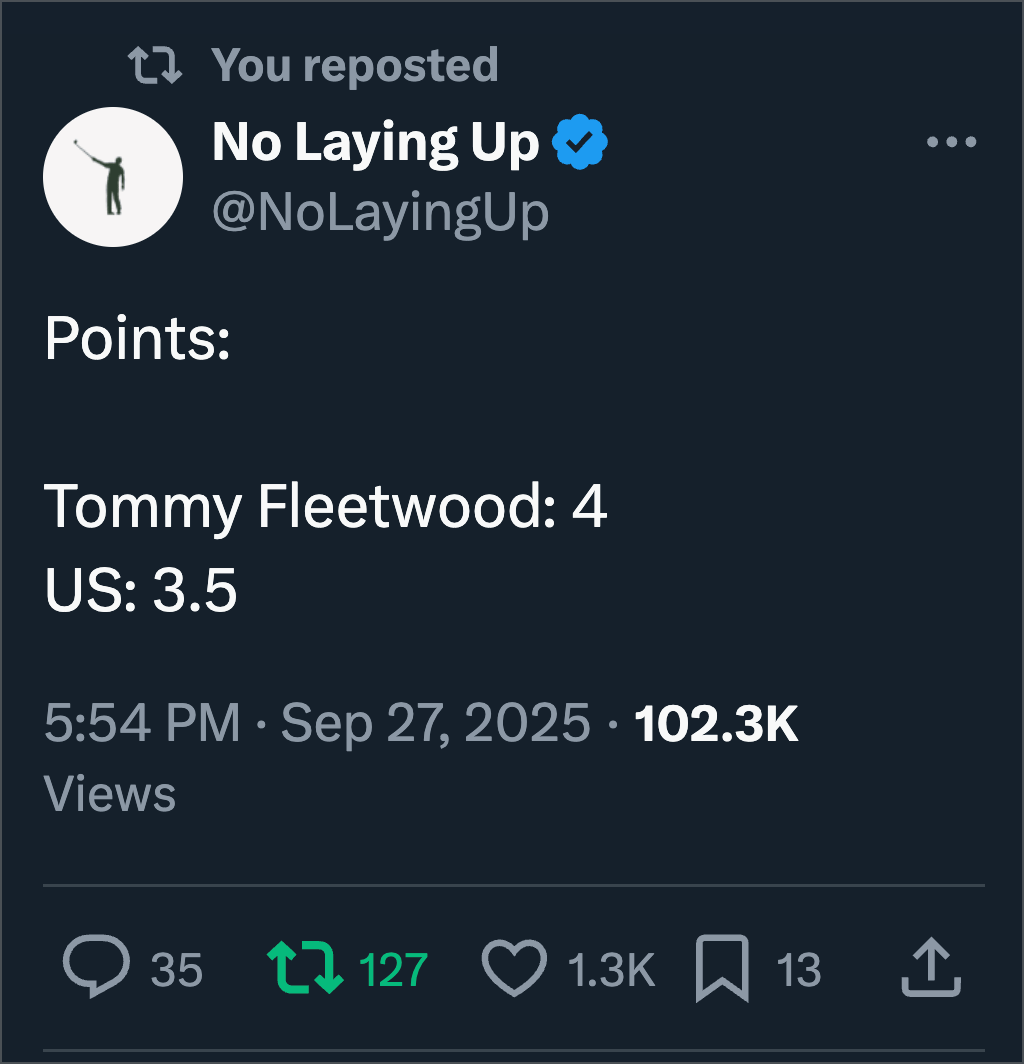 1. Let’s start here. I thought Brandel said it well. He called it “the absolute finest performance I've ever seen from a team. This European team’s performance is equivalent to what Tiger Woods did at the 2000 U.S. Open … what we saw yesterday & today is unprecedented.”